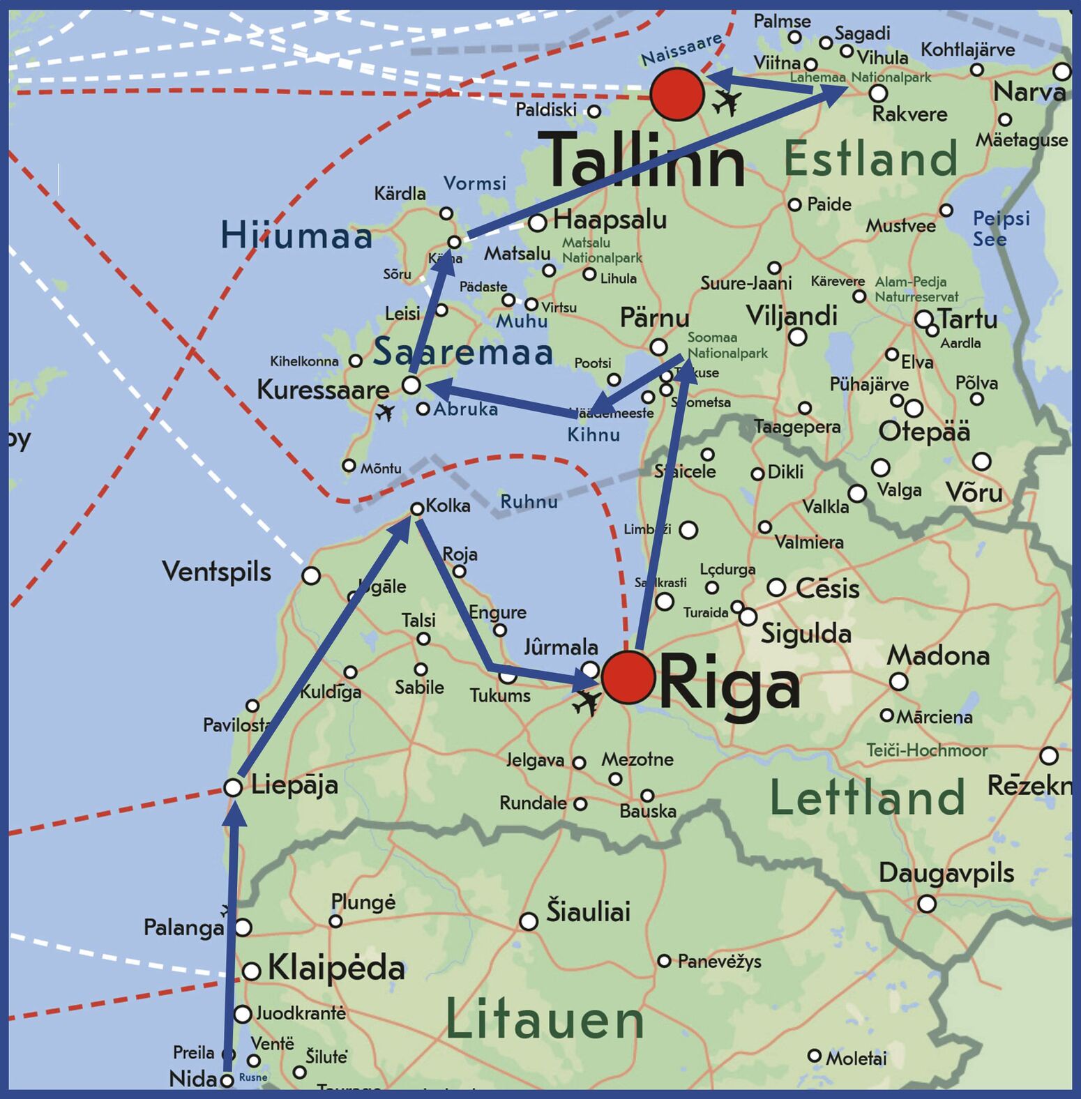 2 x Kurische Nehrung – 2 x bei Liepāja – 2 x Šlītere Nationalpark – 2 x Riga – 2 x Soomaa Nationalpark – 2 x Insel Kihnu – 2 x Insel Saaremaa – 2 x Insel Hiiumaa – 2 x Lahemaa Nationalpark – 2 x Tallinn