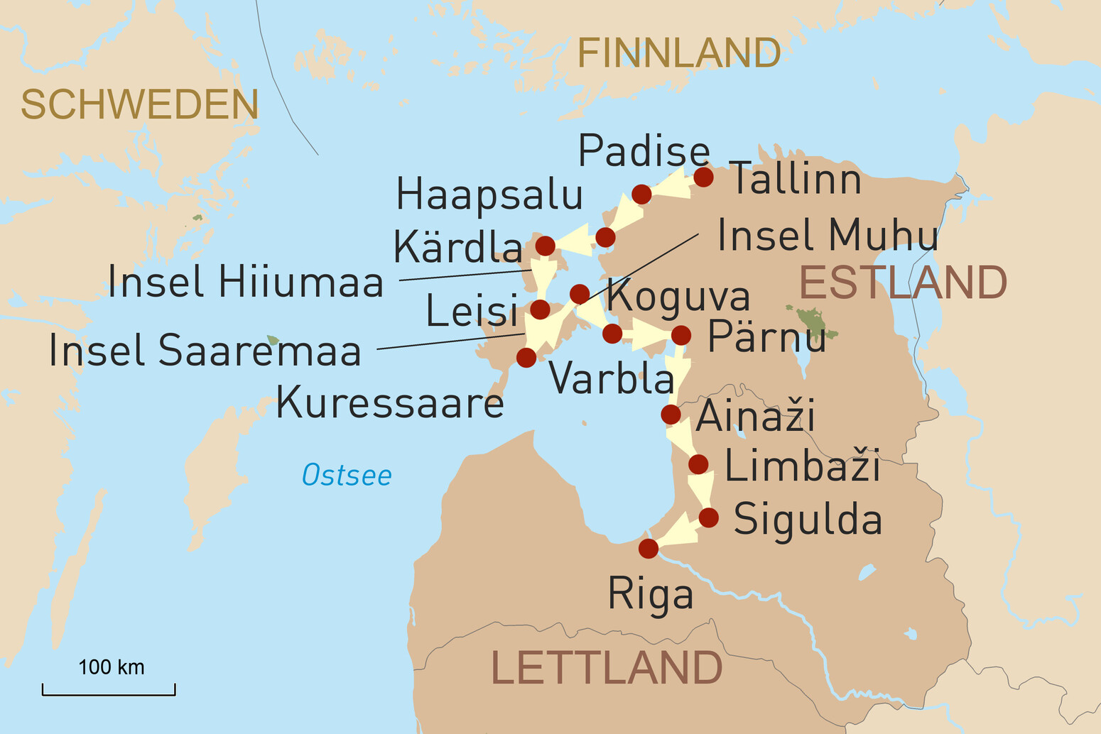Genießen Sie eine unvergessliche Fahrradtour von Tallinn nach Riga. Dabei geht es über Haapsalu auf die Inseln Hiiumaa, Saaremaa und Muhu. Anschließend fahren Sie über Pärnu nach Lettland in den Gauja-Nationalpark und weiter nach Riga.