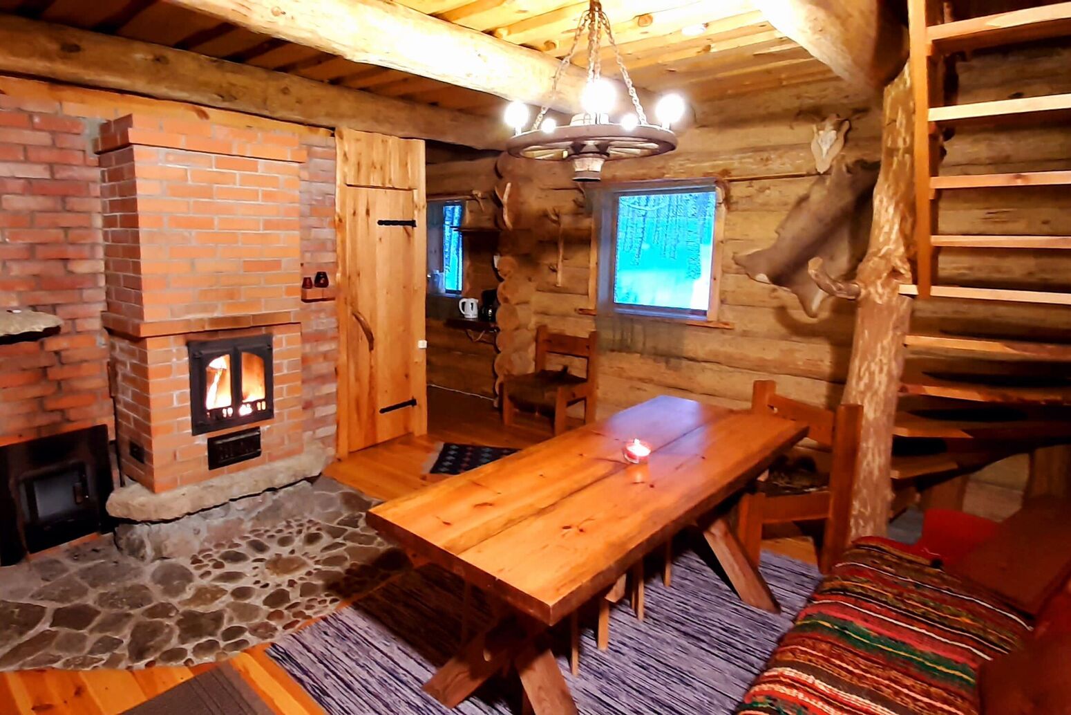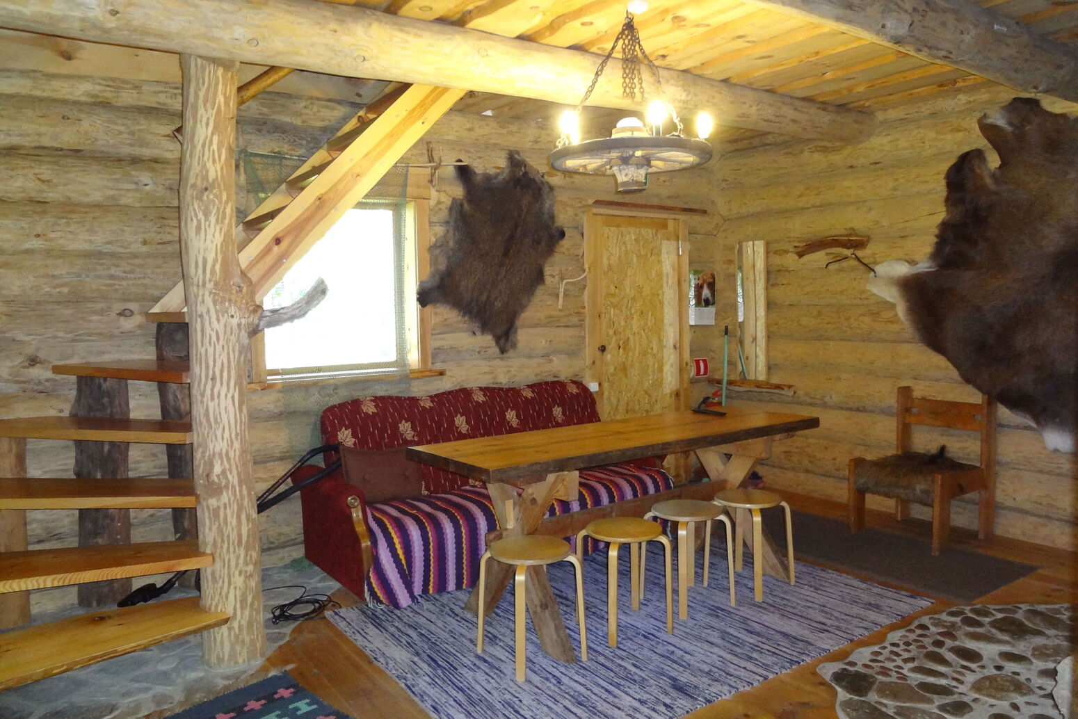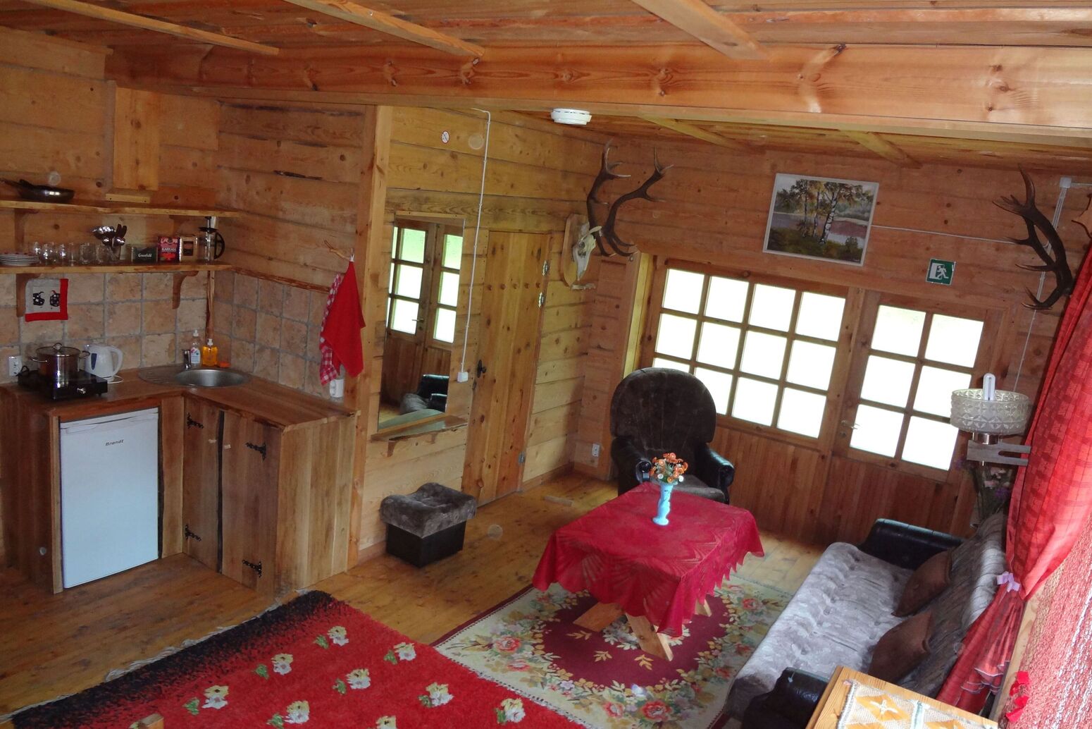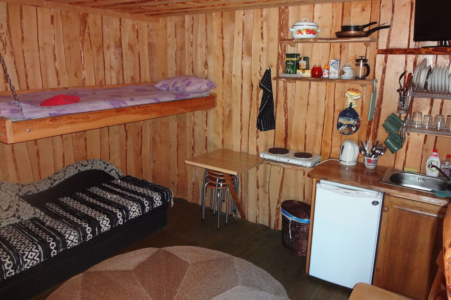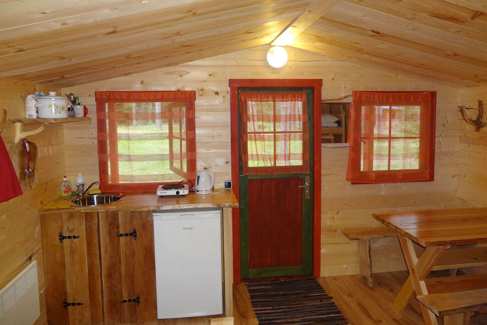 Es gibt einen Wohnbereich mit Küchenzeile ( 2-Herdplatten, Kühlschrank, Kaffemaschine, Wasserkocher etc.), ein Schlafsofa für 2 Gäste, Kamin und eine holzbeheizte Sauna. DU/WC.