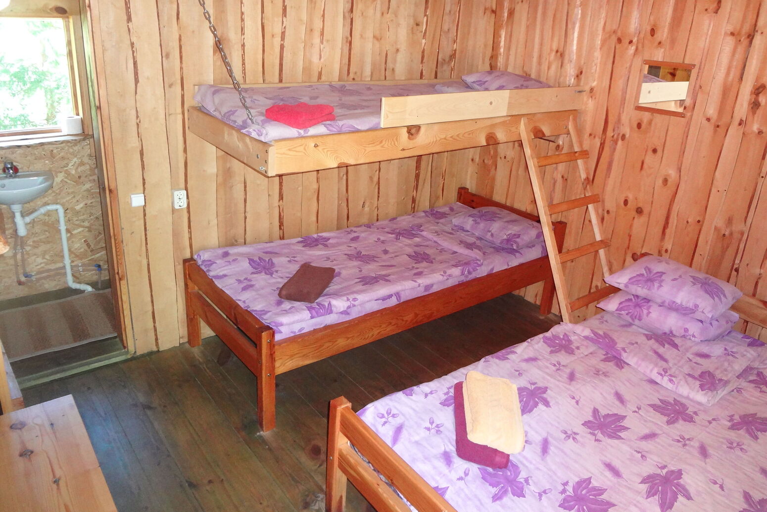 Über eine offene Treppe gelangt man in den Schlafbereich mit 1 Doppelbett, 2 Einzelbetten und einem Schlafsofa für 2 Personen, kein Kleiderschrank. Veranda mit Grill und Sitzgelegenheit.