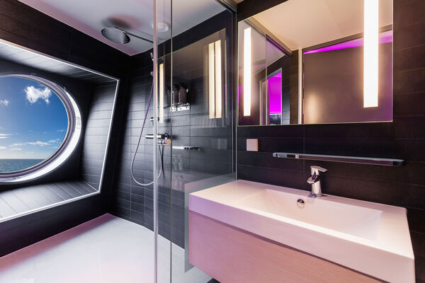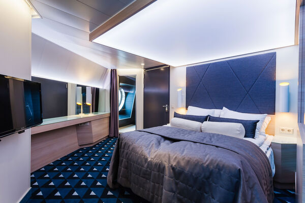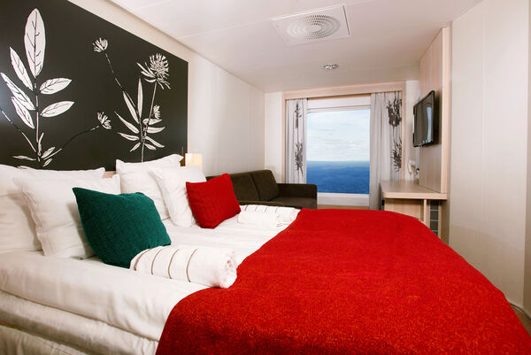 Die Außenkabinen sind mit großen Fenstern ausgestattet. Es gibt Familienkabinen, eine Doppelbettkabine kombiniert mit einer 4-Bett Kabine. Es gibt 4 exklusive Suiten, eine mit eigener Sauna oder eigenem Jacuzzi-Pool.