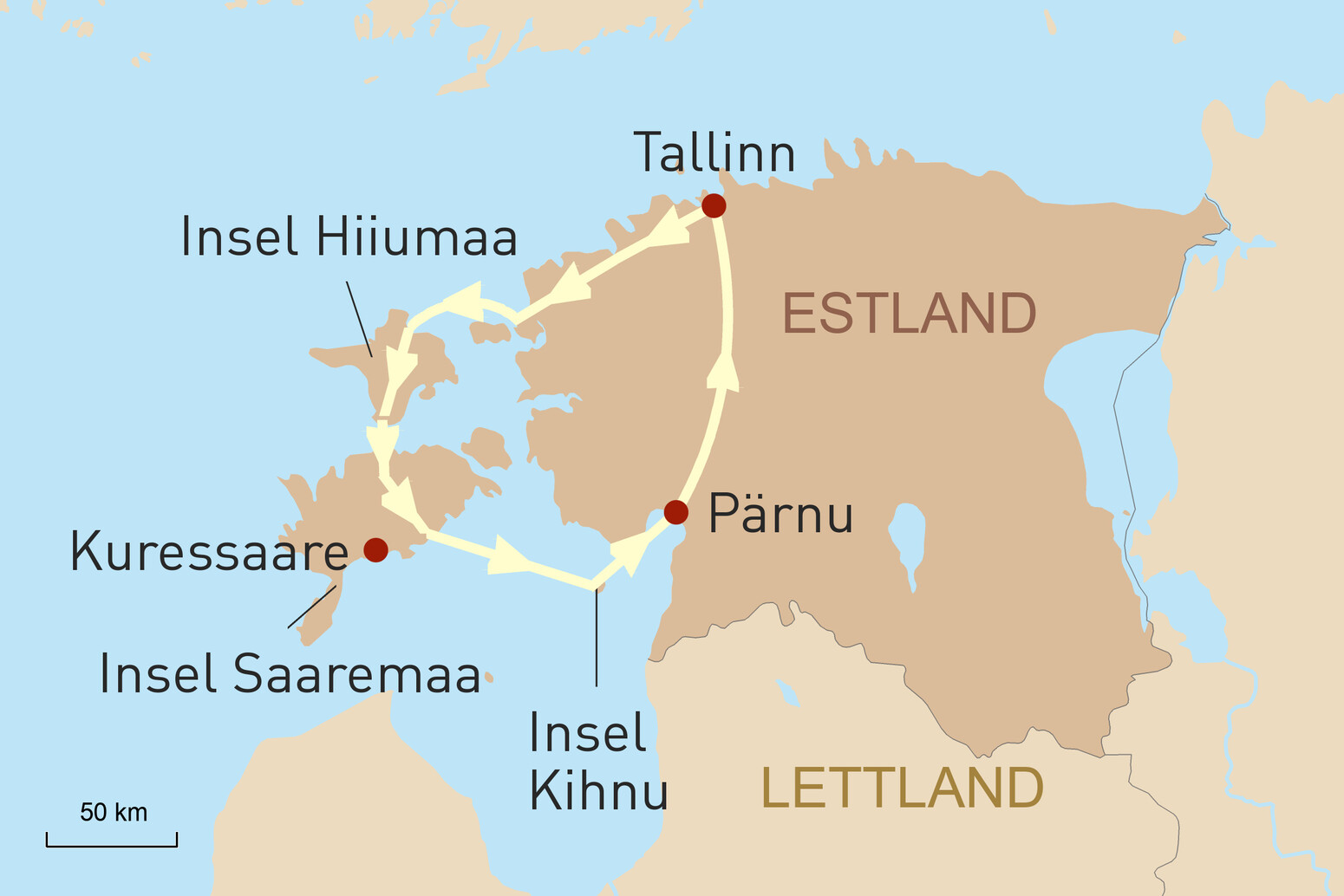 Beginnend in der mittelalterlichen Hauptstadt Tallinn führt die Route weiter zu den ruhigen Inseln Hiiumaa, Saaremaa und Kihnu. Hier erwarten Sie unberührte Natur, imposante Leuchttürme, historische Windmühlen und kleine Fischerdörfer, die den Charme des traditionellen Insellebens bewahren.