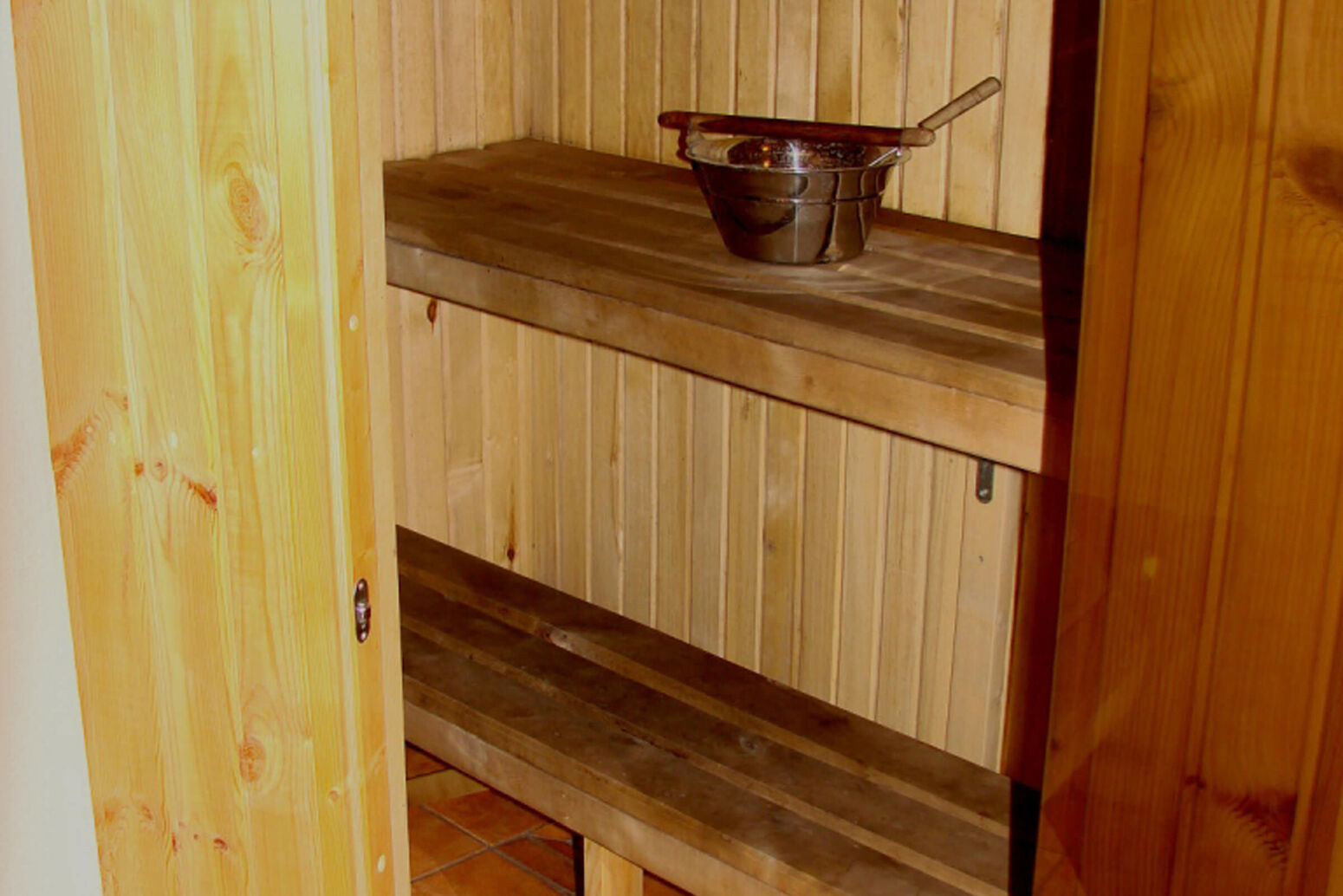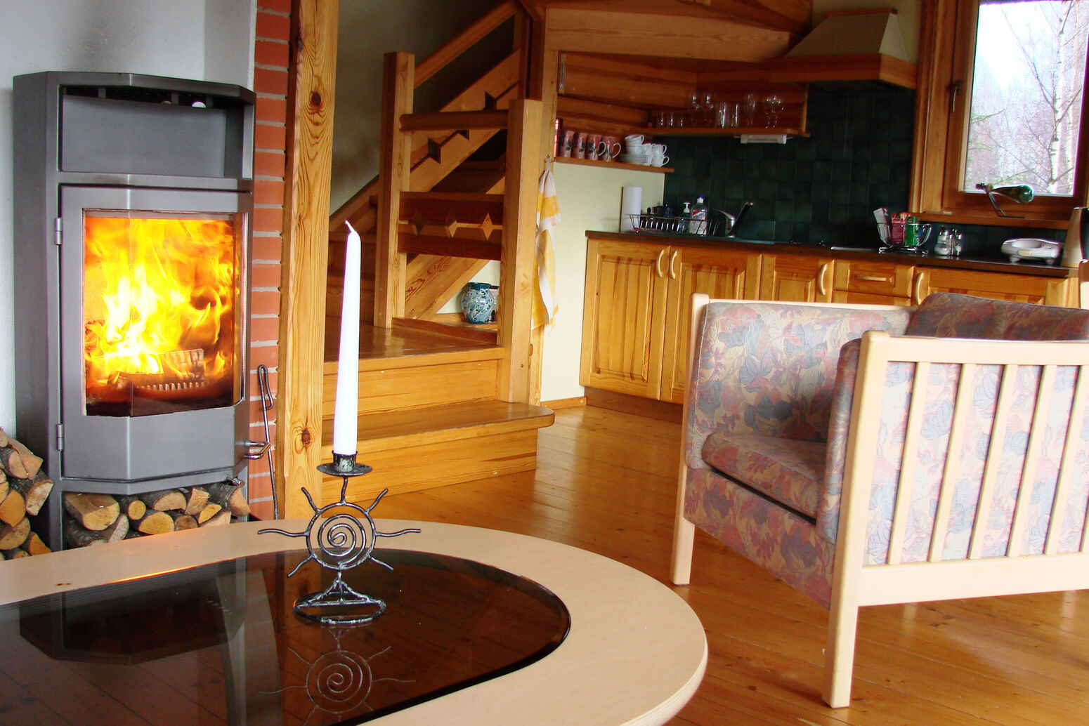 Kaminzimmer mit Kochecke und Sauna. DU/WC.