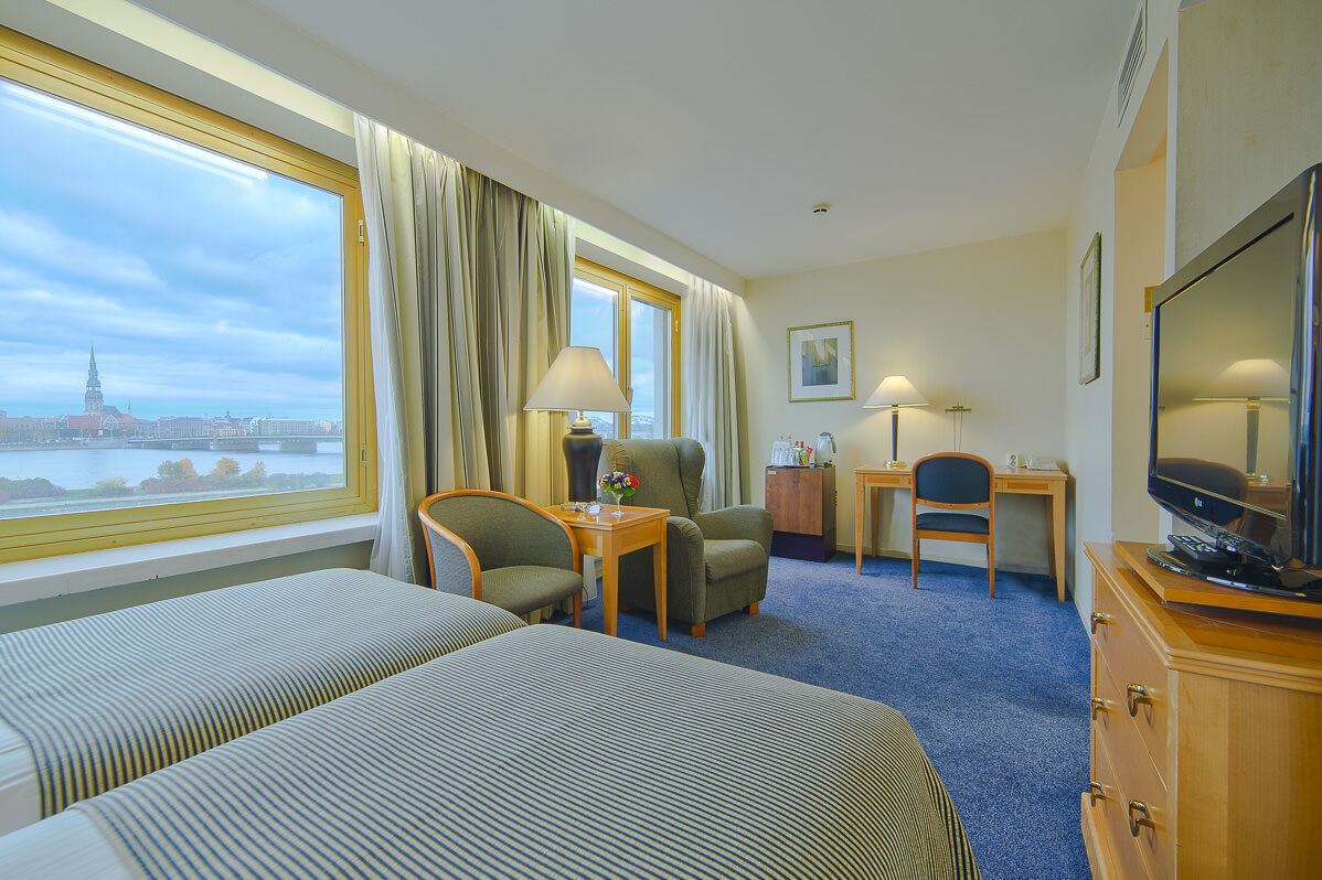 Die 355 Zimmer des Hotels Radisson Blu Daugava sind im skandinavischen Stil eingerichtet und bieten alle Bad mit DU/WC, Arbeitsbereich, Minibar, TV und WLAN.