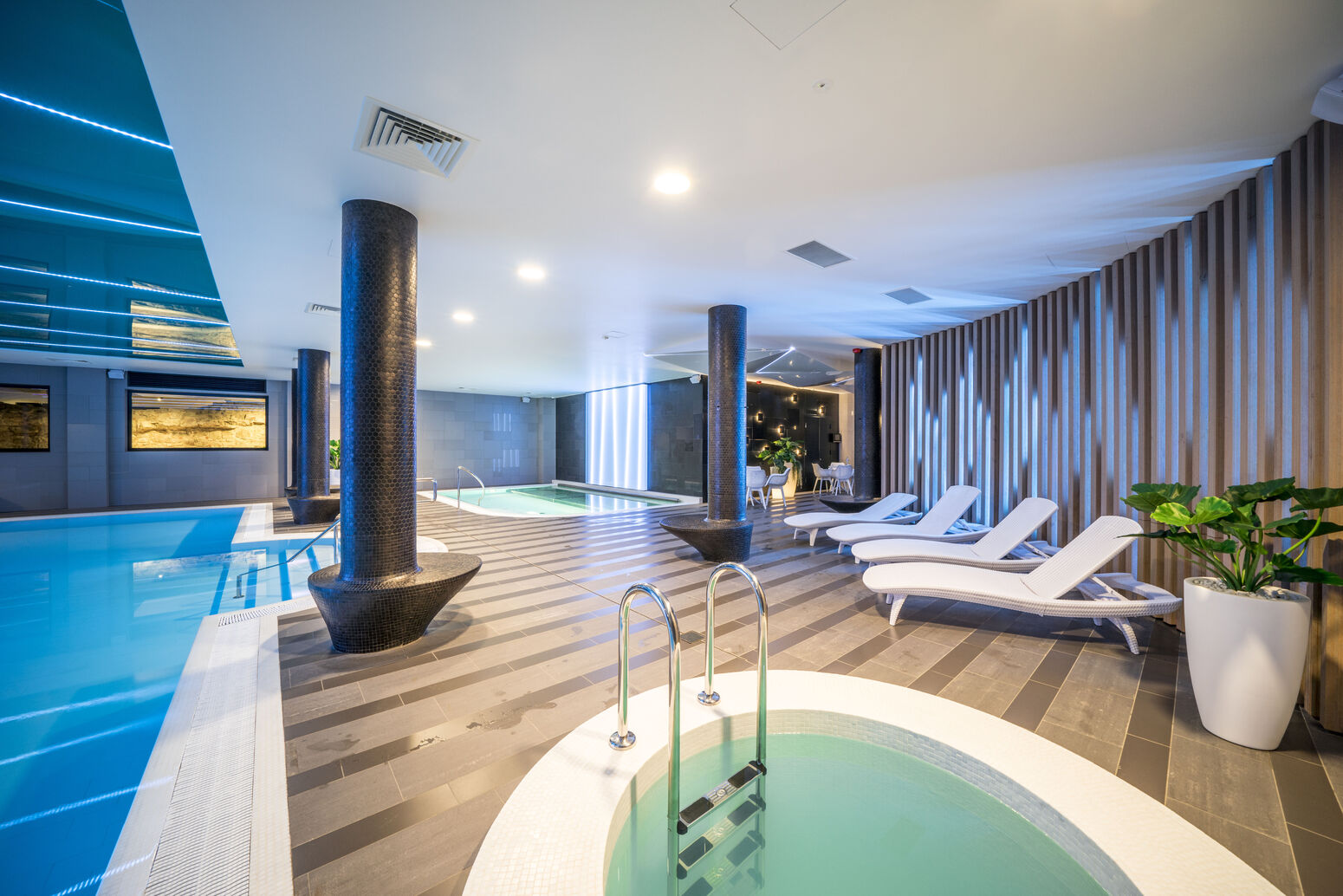 Es gibt einen Frühstücksraum und einen Wellnessbereich mit Schwimmbecken, Whirlpool, Sauna, Themenbädern und Fitnessraum. In der Lounge gibt es eine Cocktail- und Sushi Bar. Nichtraucherhotel.
