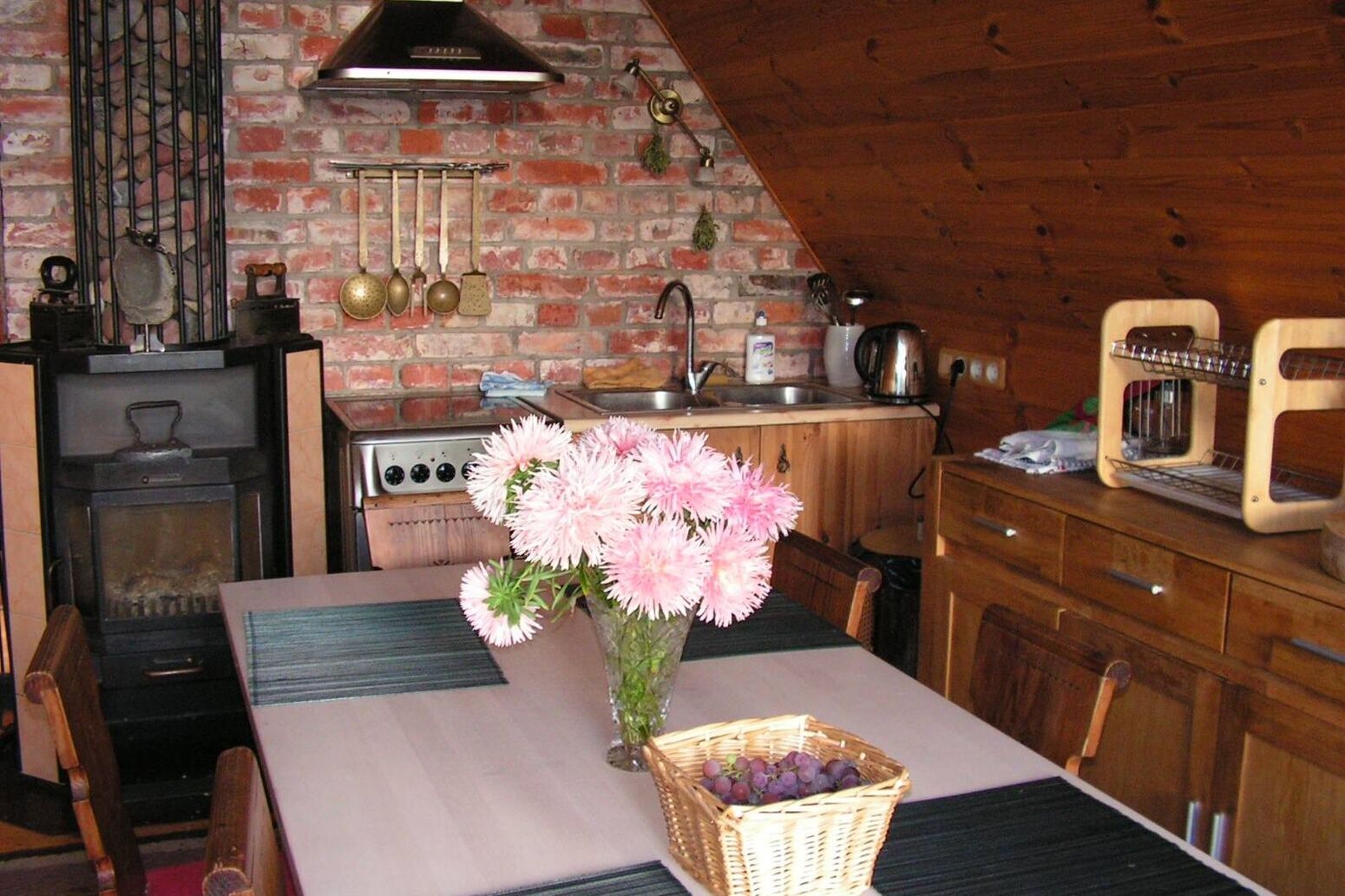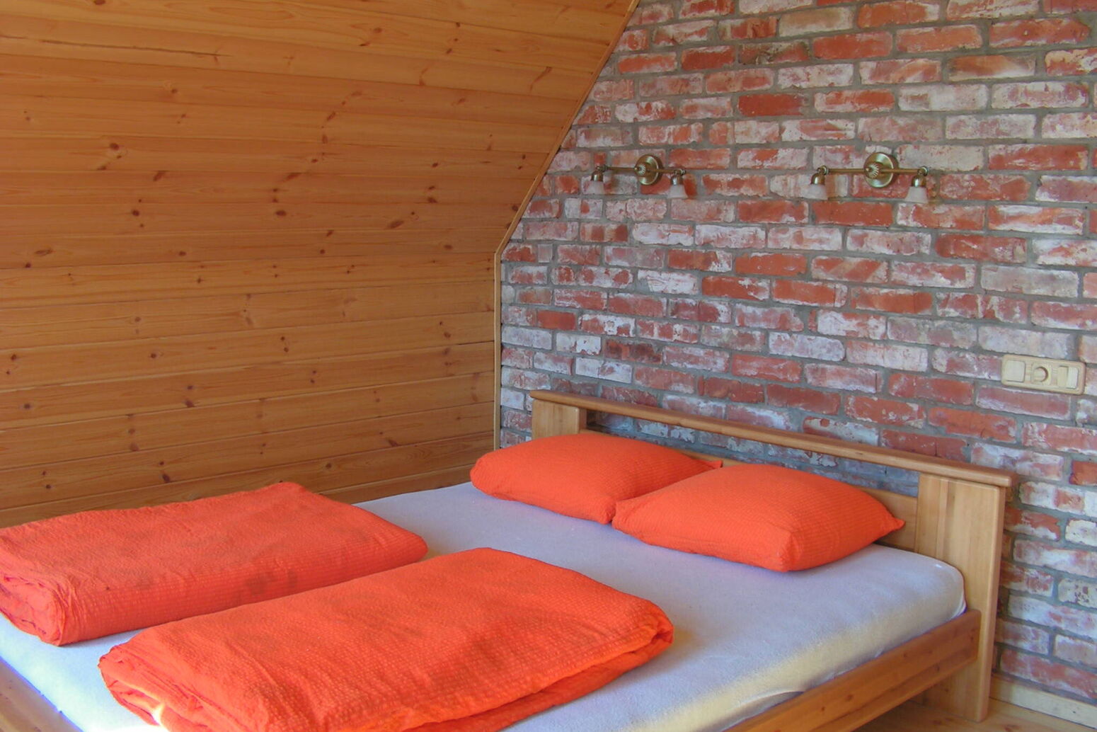 Das komfortable Ferienhaus liegt an einem Teich. Es gibt eine Küchenecke mit Speiseraum, ein großes Badezimmer mit Sauna und ein Schlafzimmer.