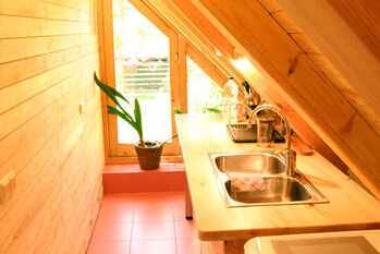 Im Erdgeschoss gibt es einen großen Wohnbereich mit Esstisch, Kamin, Küchenzeile und Toilette.