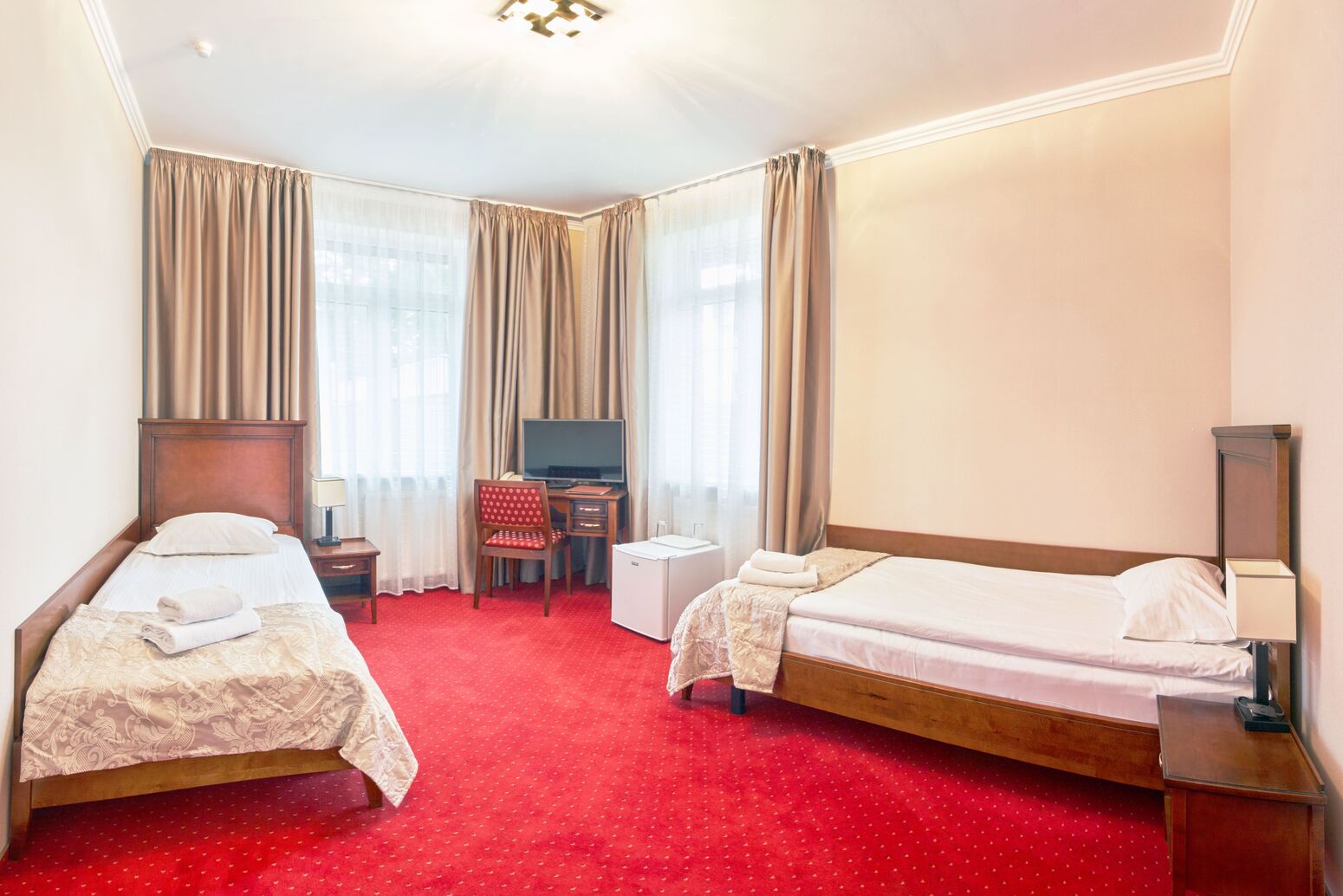 Das Hotel bietet ca. 25 Zimmer an. Alle Zimmer sind mit Flachbild-TV, Telefon, WLAN, Kühlschrank und DU/BAD/WC ausgestattet. Es gibt einen Garten mit Sommerterrasse und Grillmöglichkeiten. Das Restaurant serviert vorwiegend russische Küche.